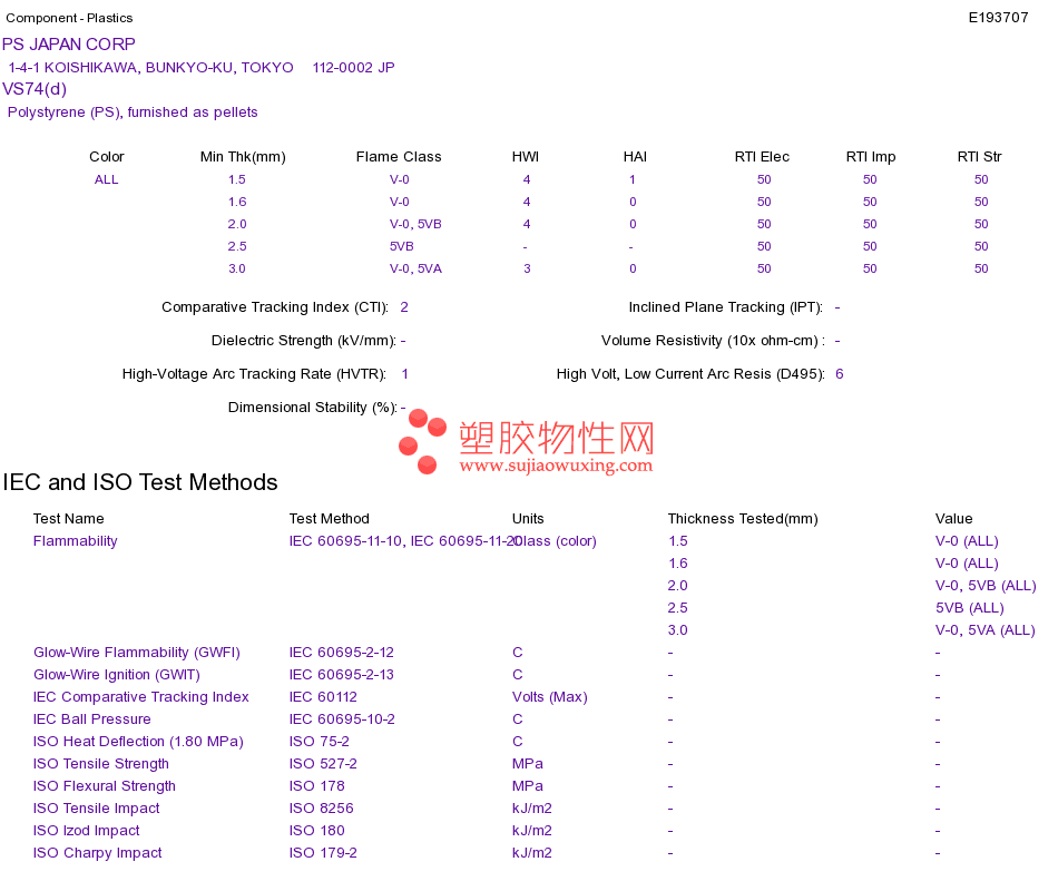 Polystyrene (PS) VS74(d)UL黄卡资料请登陆会员后查看,如需电子档资料,请联系客服! 赵生:手机13424755533;QQ:27660005