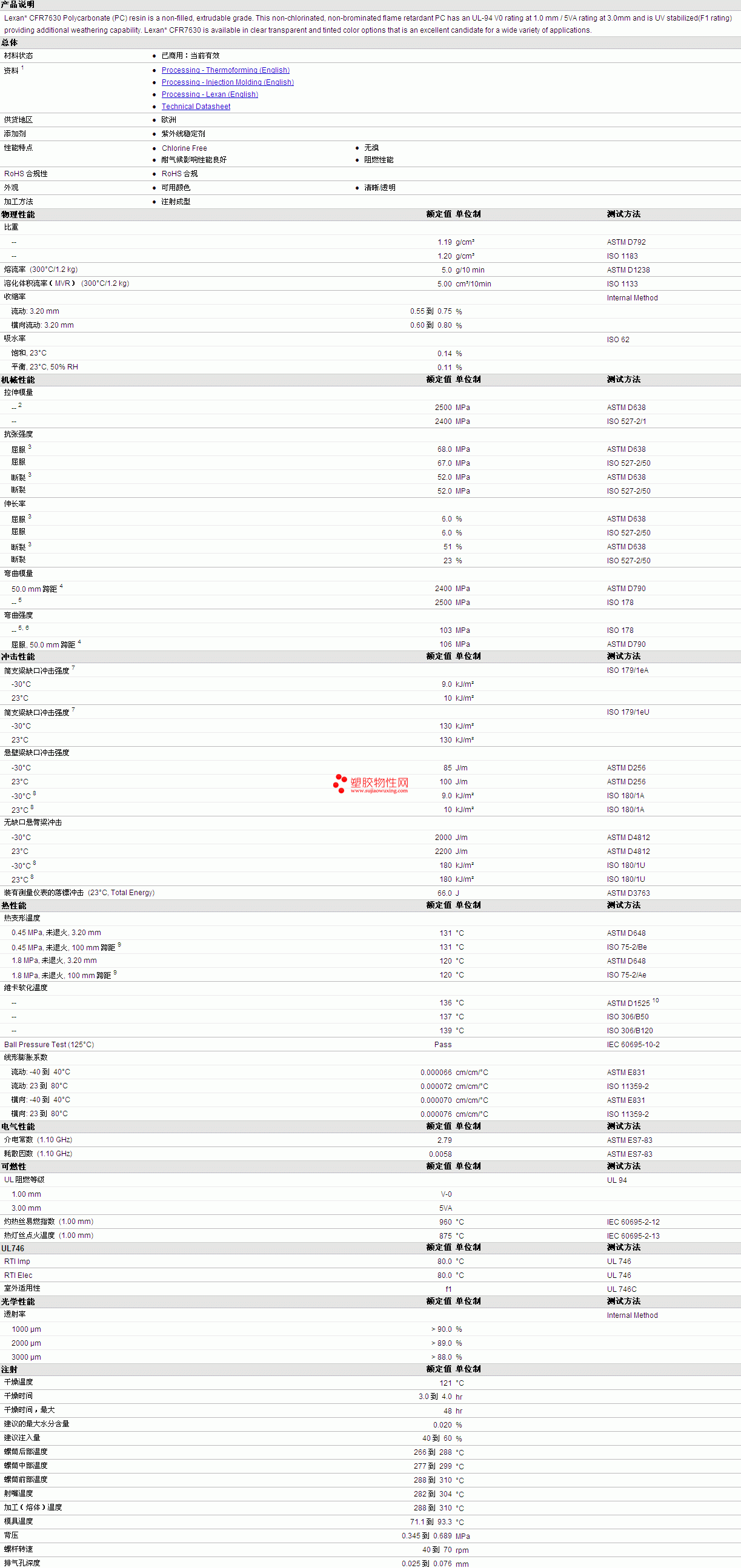 LEXAN PC CFR7630 Resin物性表详情见附件
