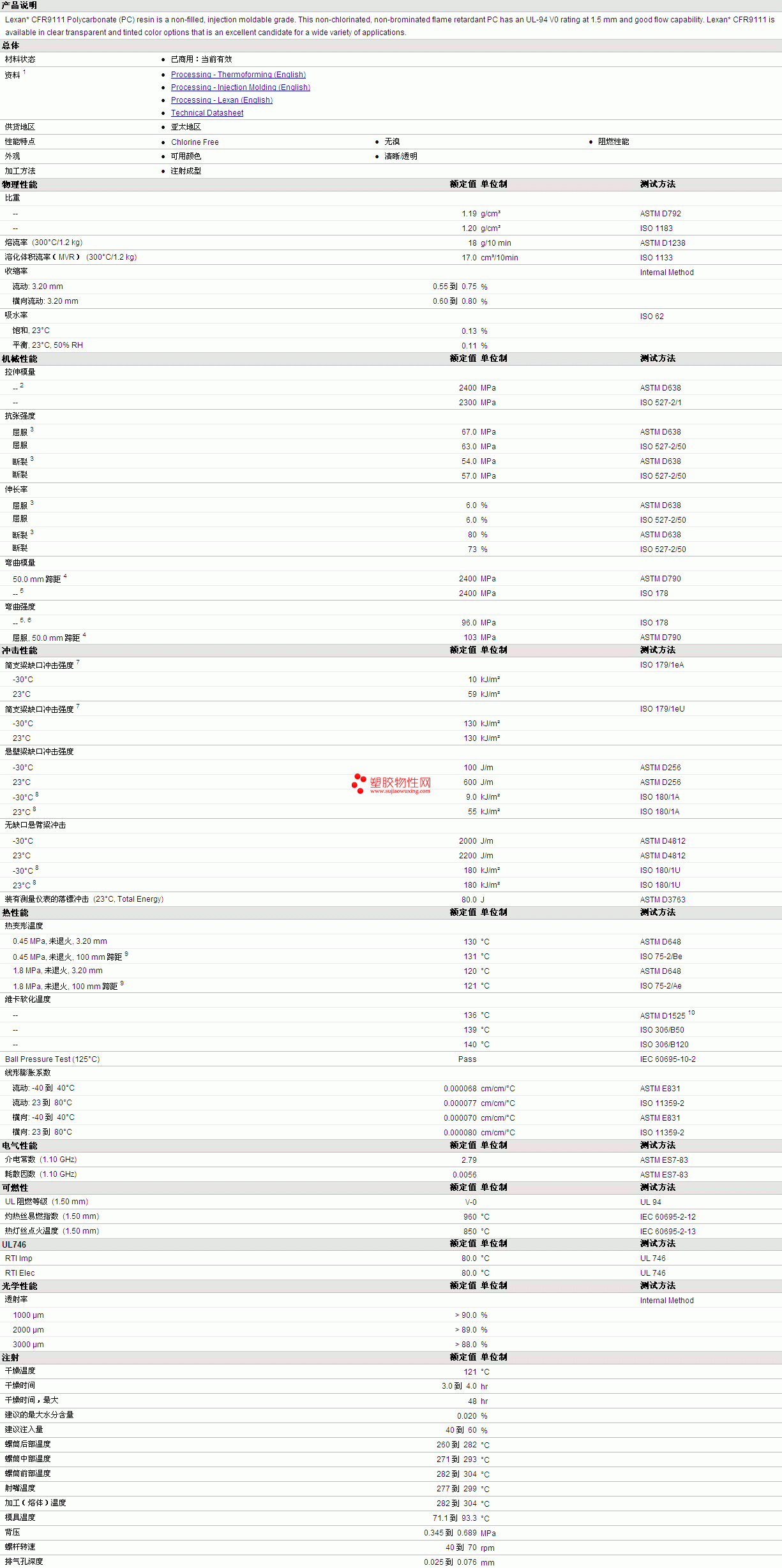 LEXAN PC CFR9111 Resin物性表详细情况如图