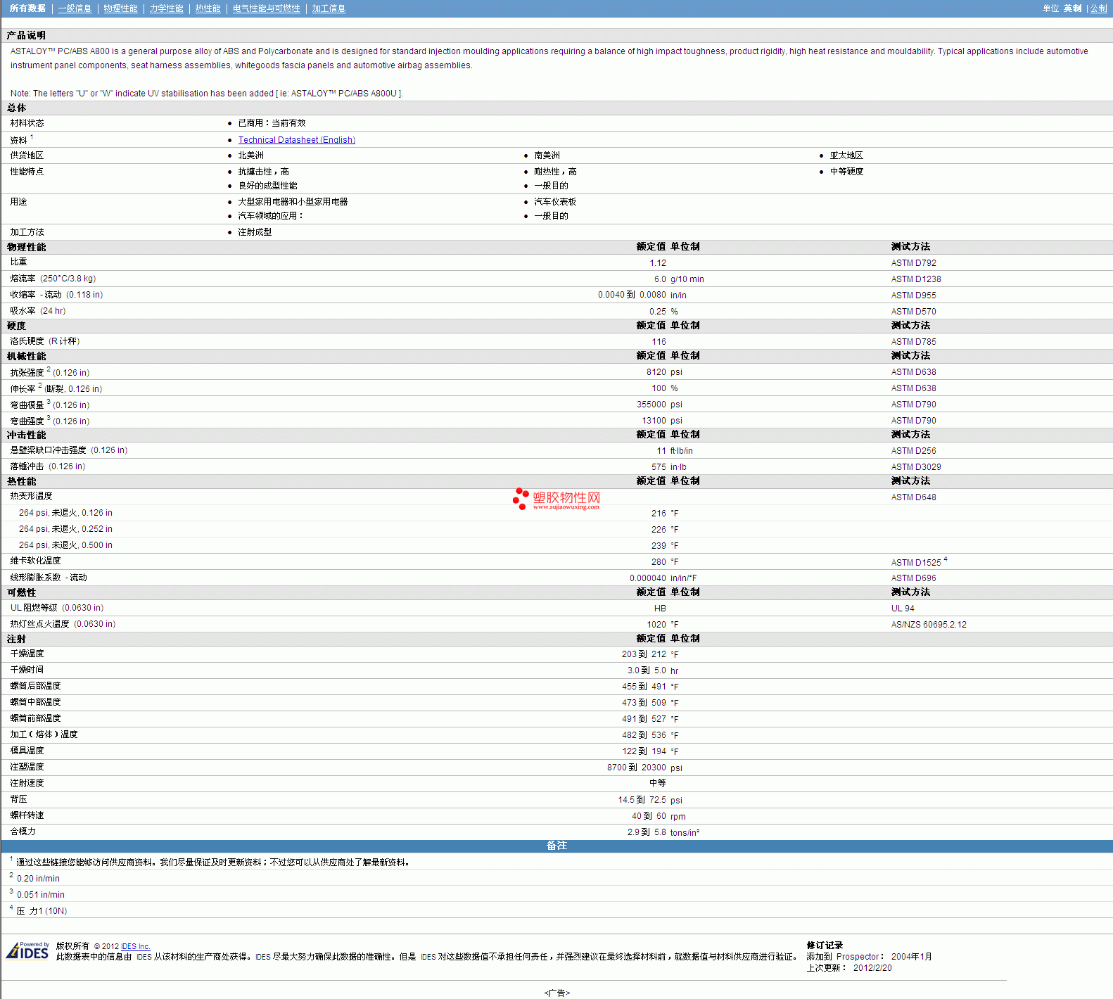 更多ASTALOY PC/ABS A800物性表报价,图片、材质证明、UL黄卡、物质安全资料表(MSDS)等可来电咨询赵先生:13424755533或QQ: 27660005