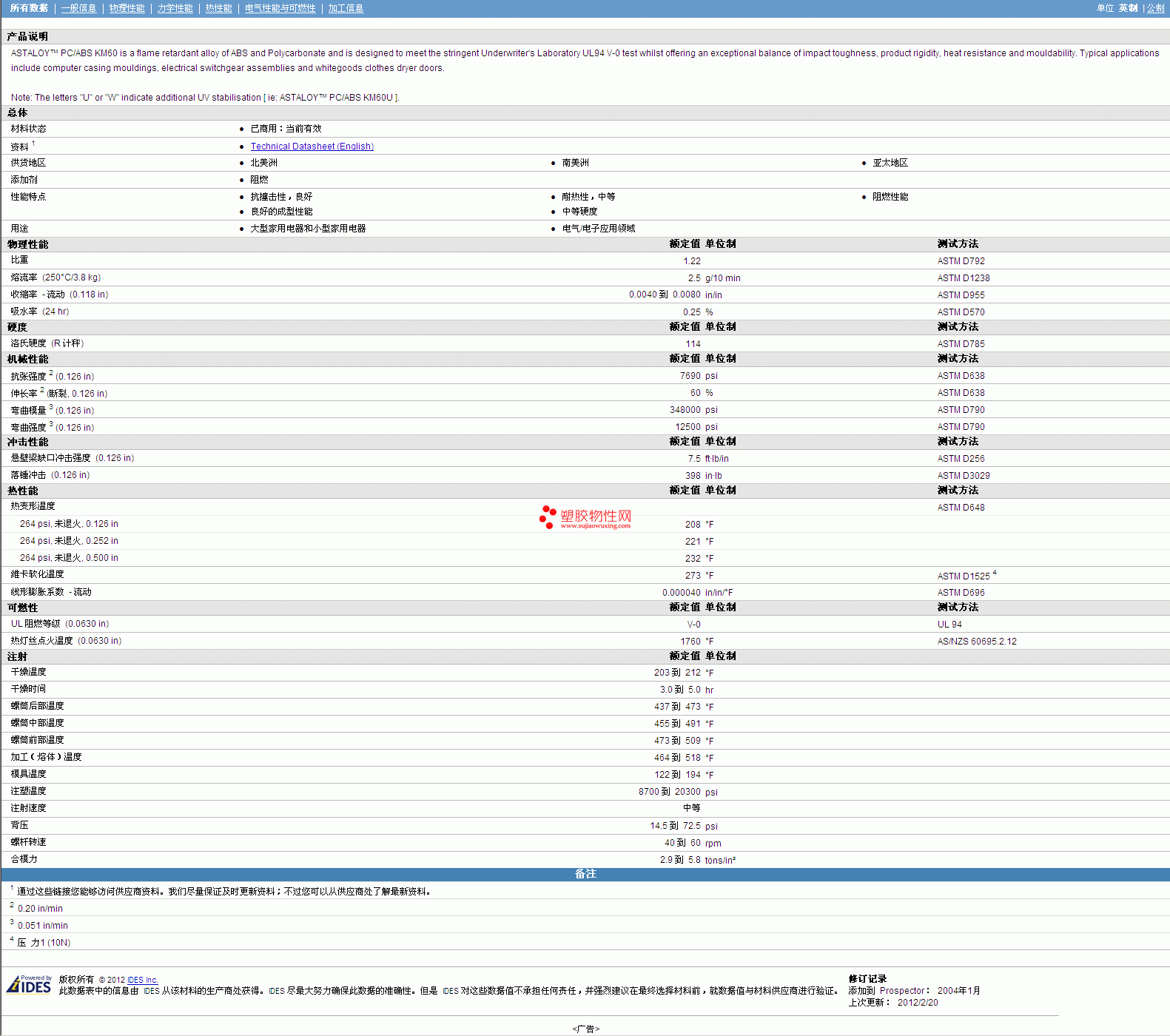 更多ASTALOY PC/ABS KM60 物性表报价,图片、材质证明、UL黄卡、物质安全资料表(MSDS)等可来电咨询赵先生:13424755533或QQ: 27660005