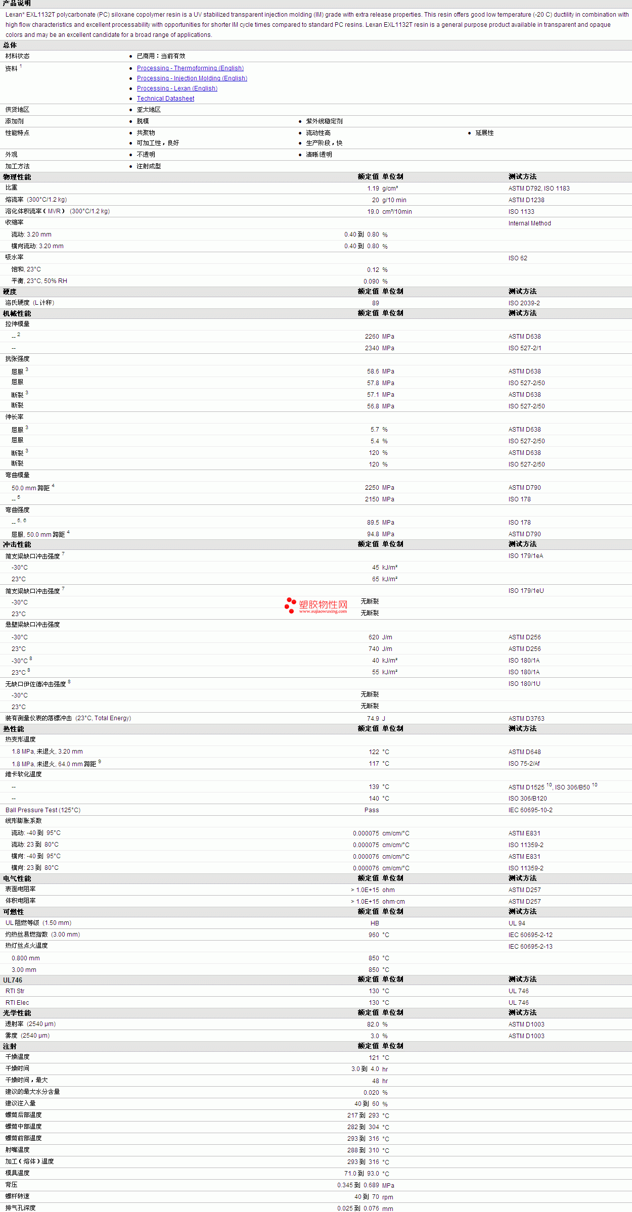 LEXAN PC EXL1132T Resin物性表详情见附件