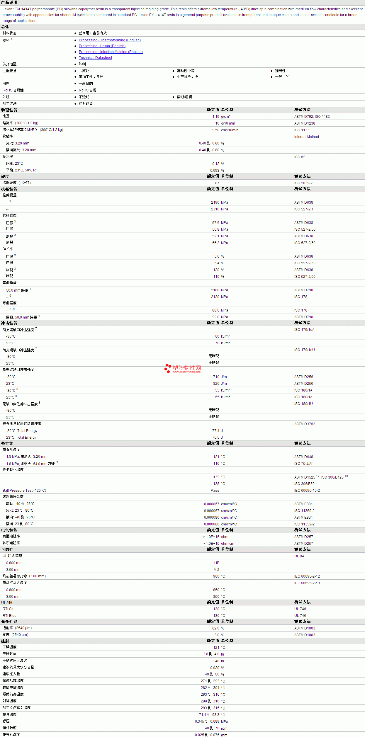 LEXAN PC EXL1414T Resin 物性表详细情况如图