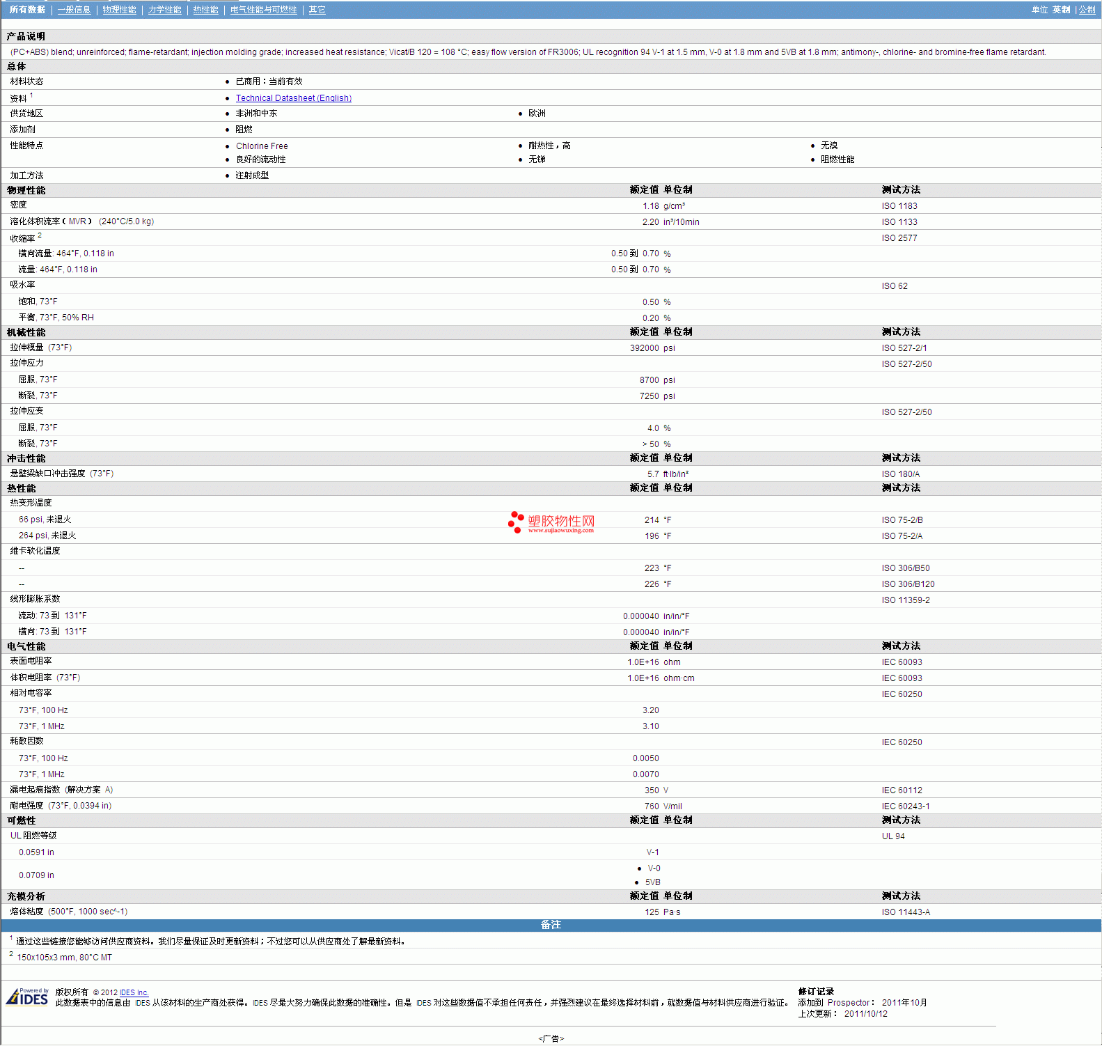 | 溶化体积流率(MVR) (240°C/5.0 kg) | 2.20 | in³/10min | ISO 1133 |