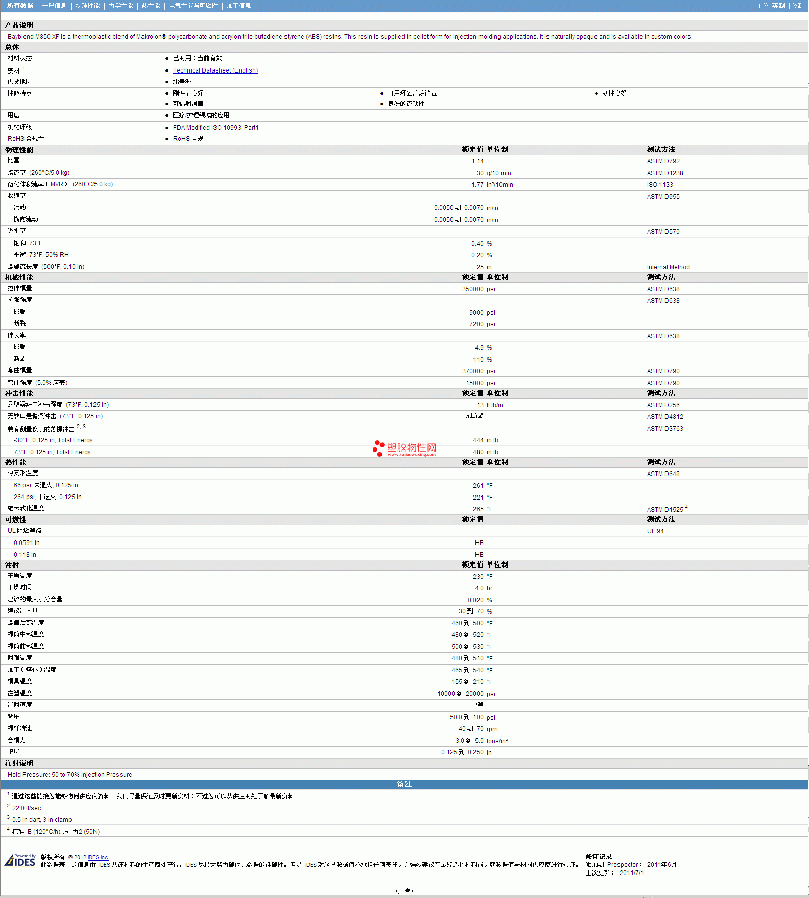 | 溶化体积流率(MVR) (260°C/5.0 kg) | 1.77 | in³/10min | ISO 1133 |
