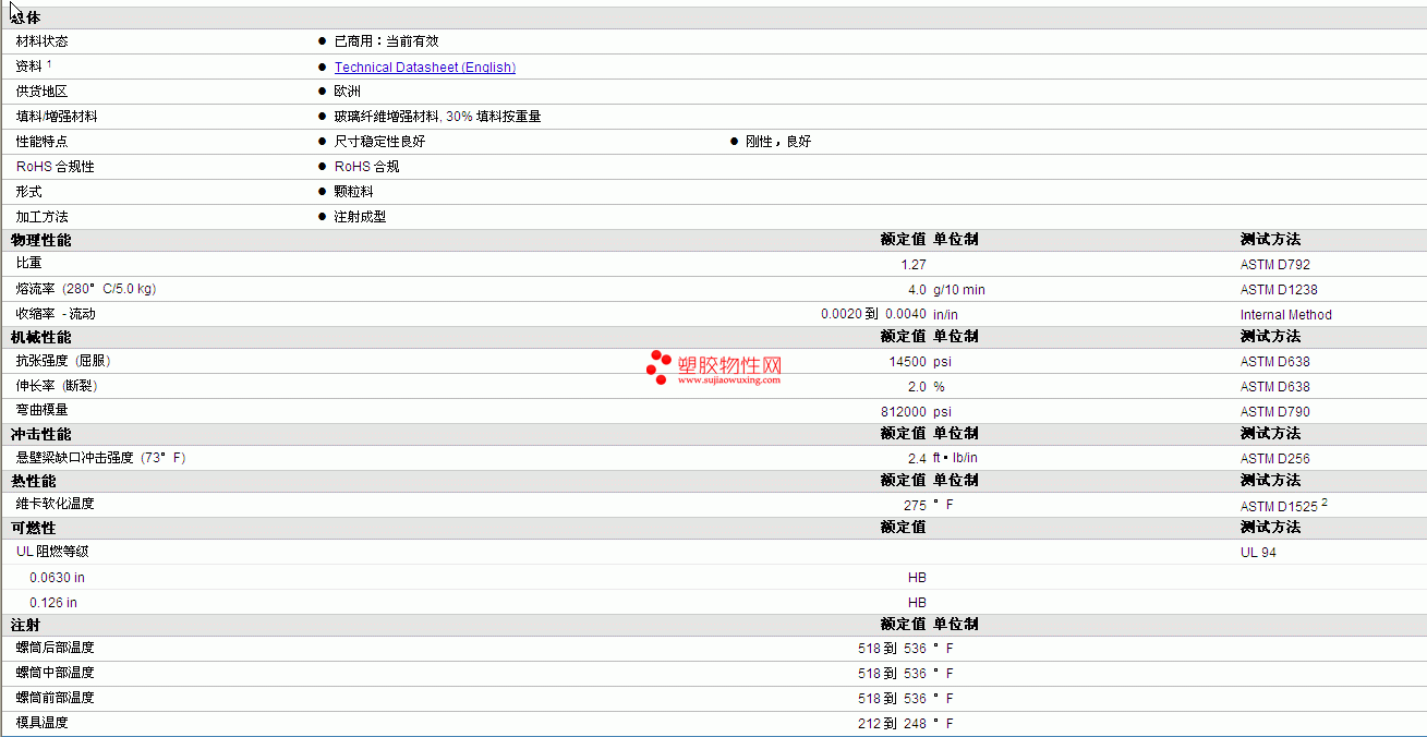 | 弯曲模量 | 812000 | psi | ASTM D790 |