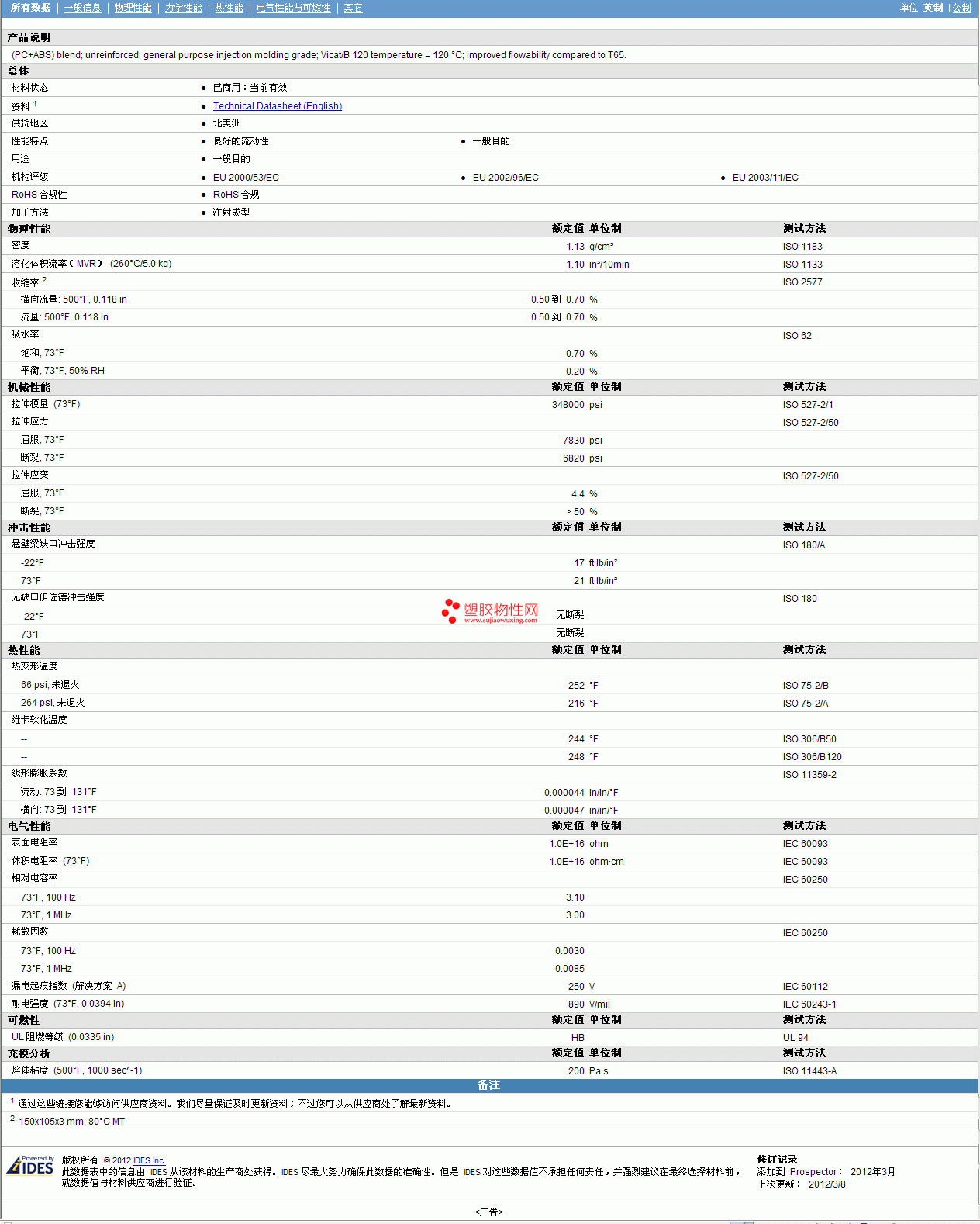 | 溶化体积流率(MVR) (260°C/5.0 kg) | 1.10 | in³/10min | ISO 1133 |