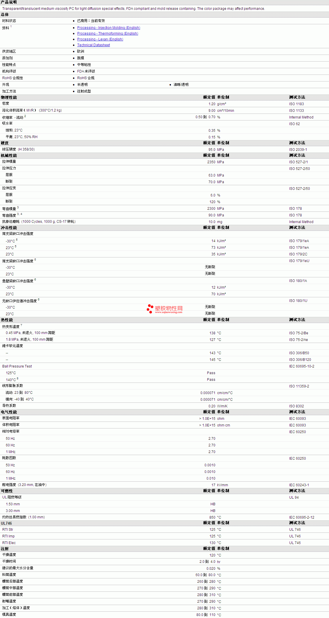 LEXAN PC FXD164R Resin物性表详细情况如图