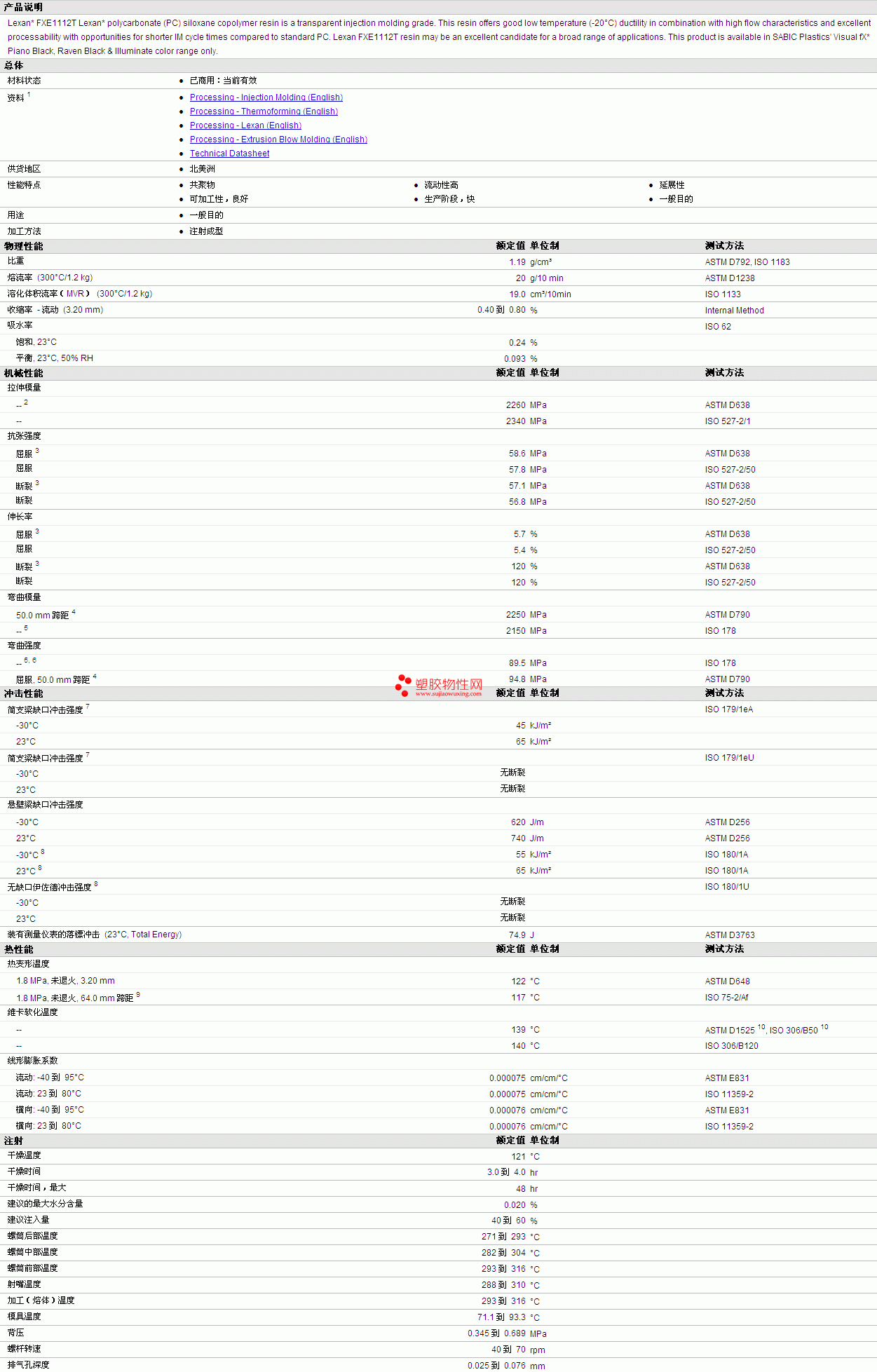 LEXAN PC FXE1112T Resin物性表详情见附件
