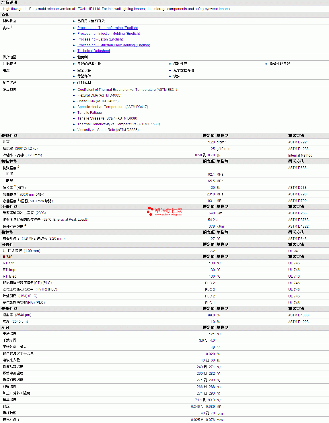 LEXAN PC HF1110R Resin物性表详情见附件