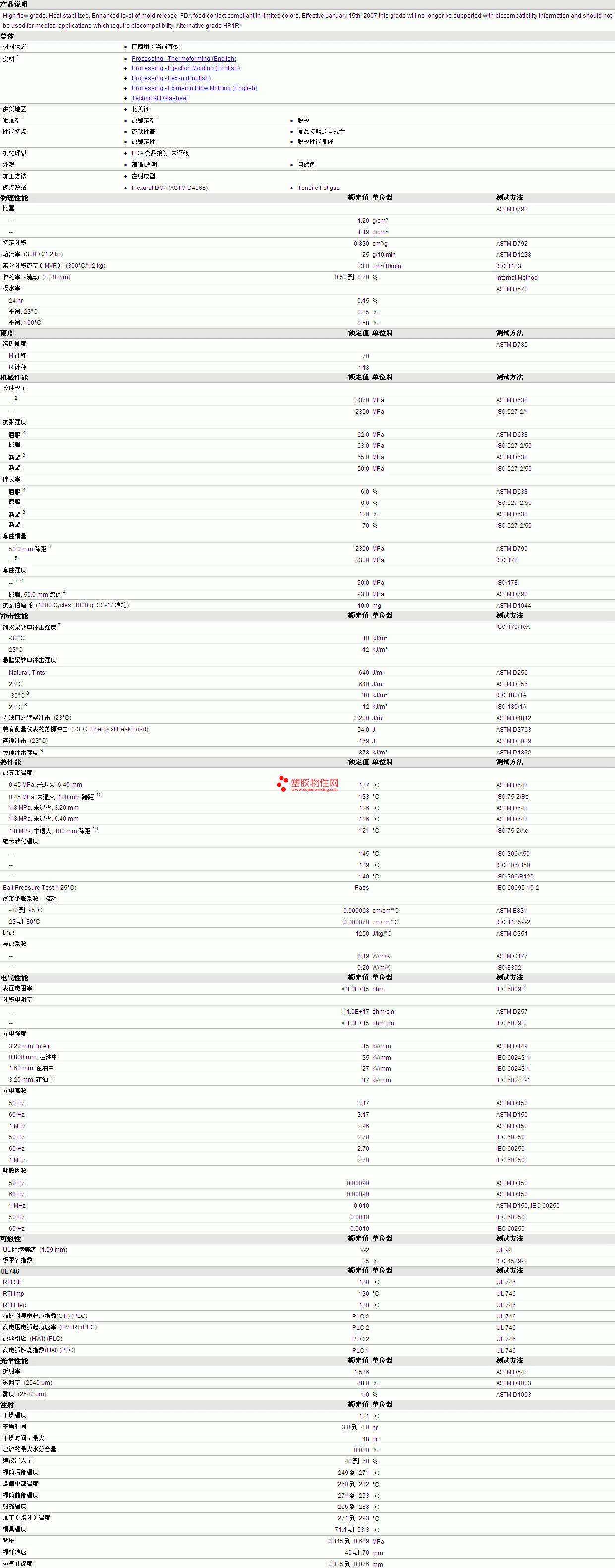 LEXAN PC HF1140R Resin物性表详细情况如图