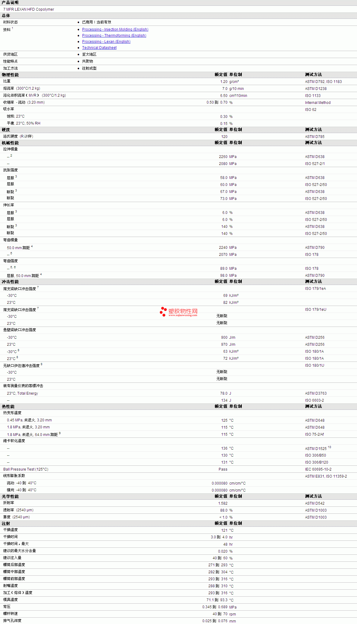 LEXAN PC HFD1014 Resin物性表更多资料见图