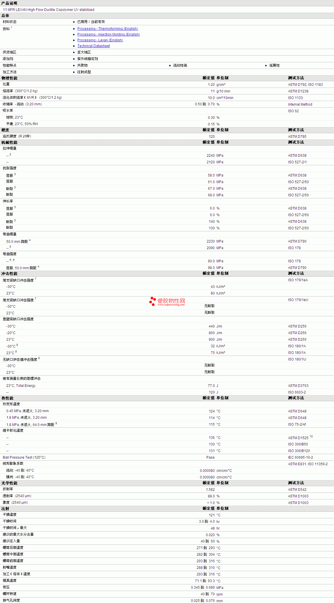 LEXAN PC HFD1433 Resin 物性表如图所示