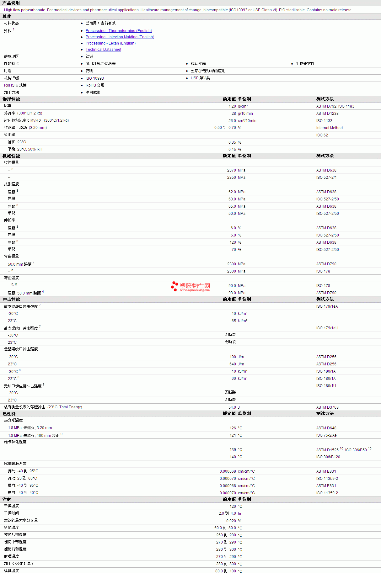 LEXAN PC HP1NREU Resin物性表详细情况如图
