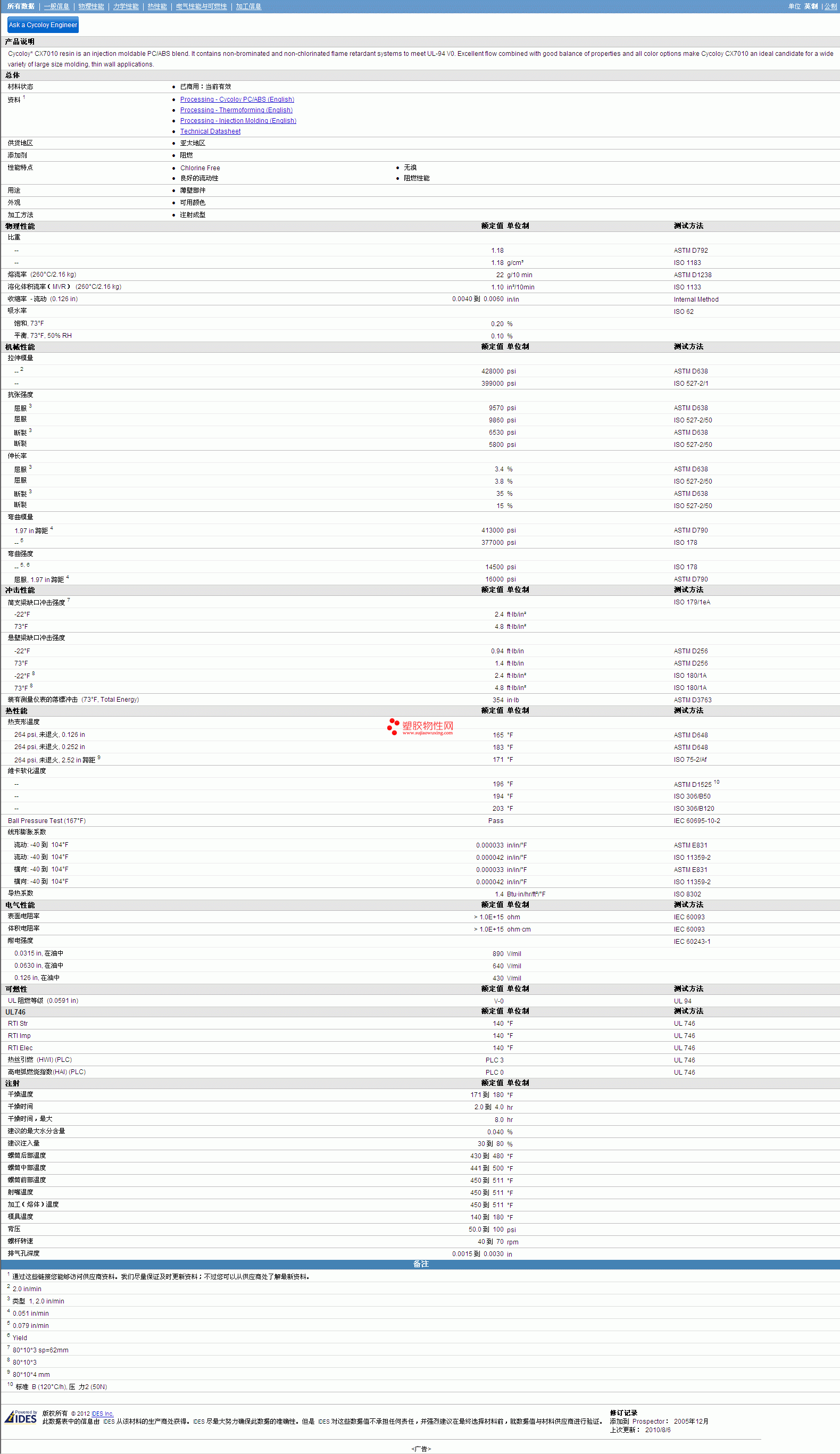 如需了解CYCOLOY ABS/PC CX7010 Resin物性表更多详情,ROHS(SGS)报告、物质安全资料表(MSDS)、材质证明、UL黄卡等,最新行情报价等可来电咨询:赵先生:13424755533或QQ: 27660005