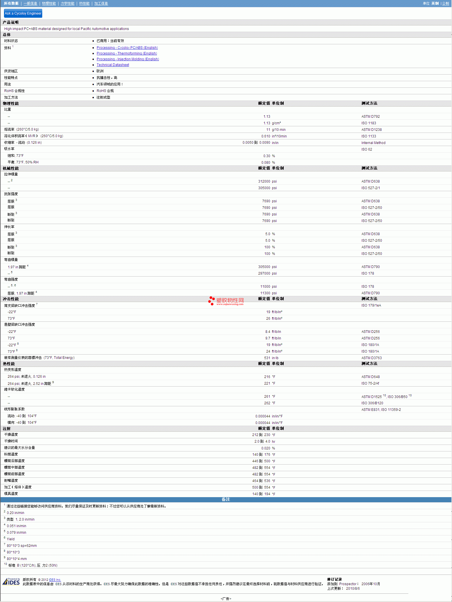 需要了解CYCOLOY ABS/PC CY100FC Resin更多详情,赵先生:13424755533或QQ: 27660005