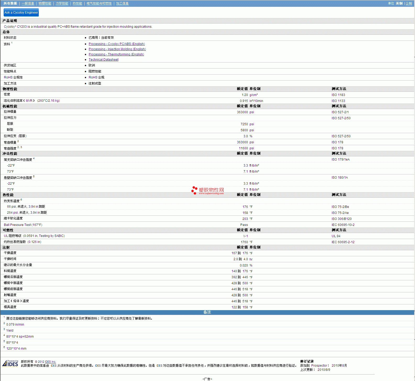需了解CYCOLOY ABS/PC CY203 Resin物性表更多详情,材质证明、ROHS(SGS)报告、物质安全资料表(MSDS)、UL黄卡等,最新行情报价等可来电咨询:赵先生:13424755533或QQ: 27660005
