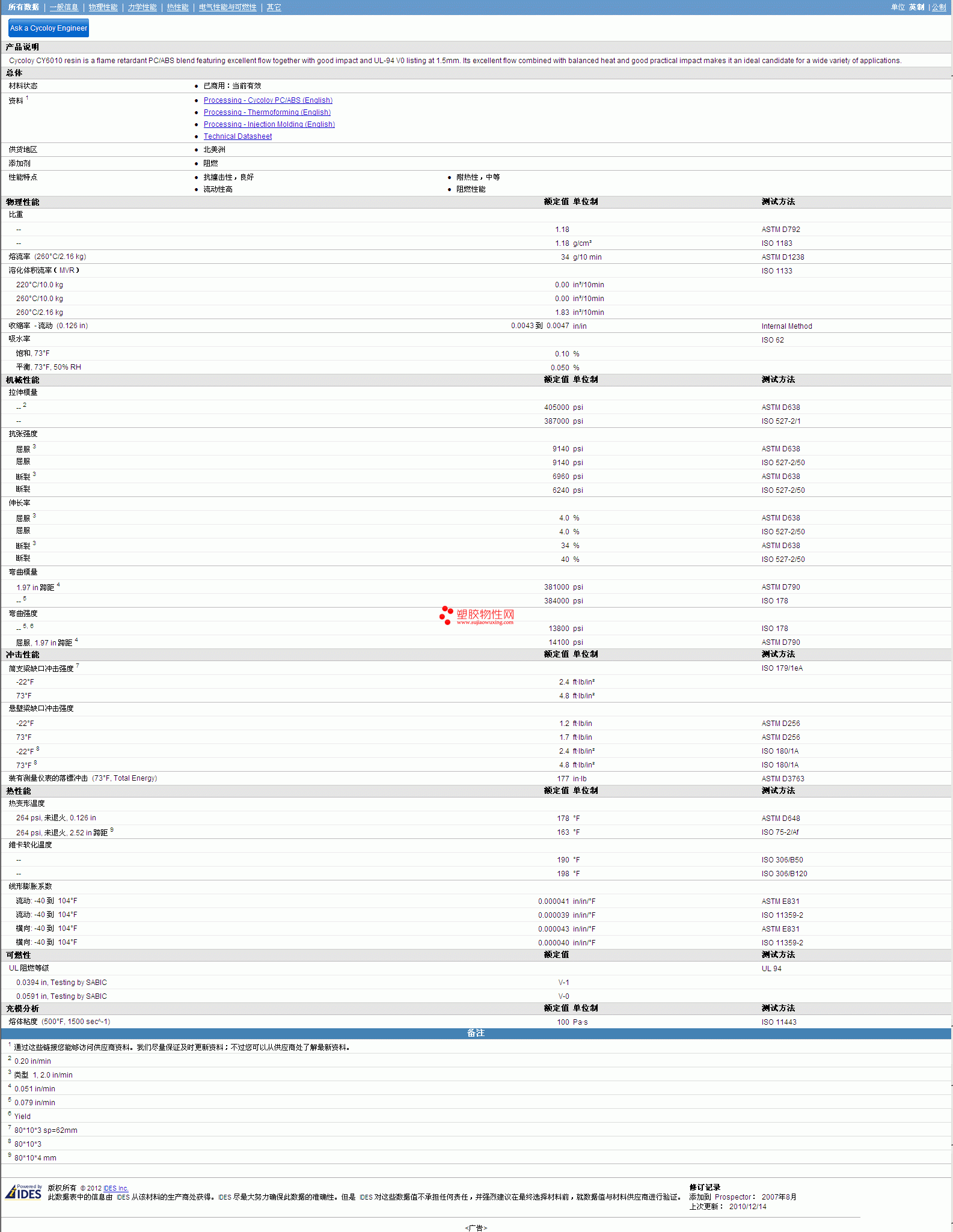 更多CYCOLOY ABS/PC CY6010 Resin物性表报价,图片、材质证明、UL黄卡、物质安全资料表(MSDS)等可来电咨询赵先生:13424755533或QQ: 27660005