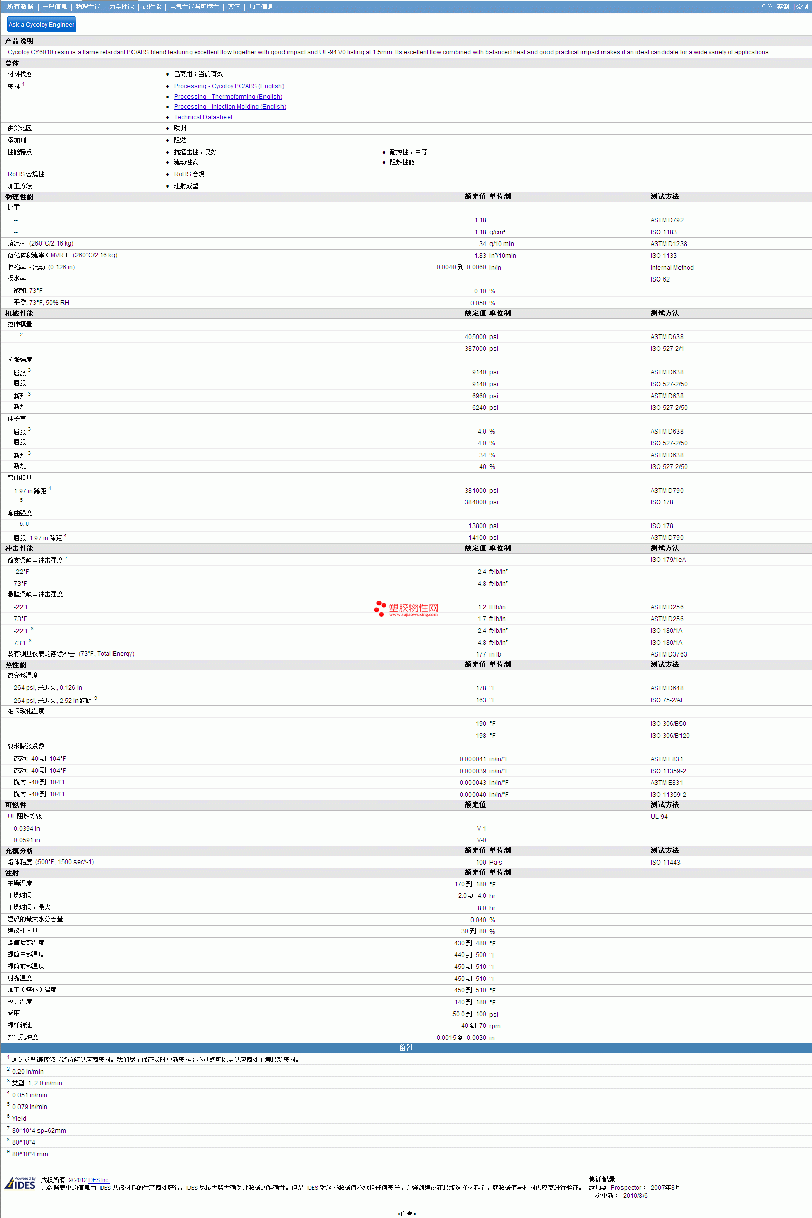 更多CYCOLOY ABS/PC CY6010 Resin物性表报价,图片、材质证明、UL黄卡、物质安全资料表(MSDS)等可来电咨询赵先生:13424755533或QQ: 27660005