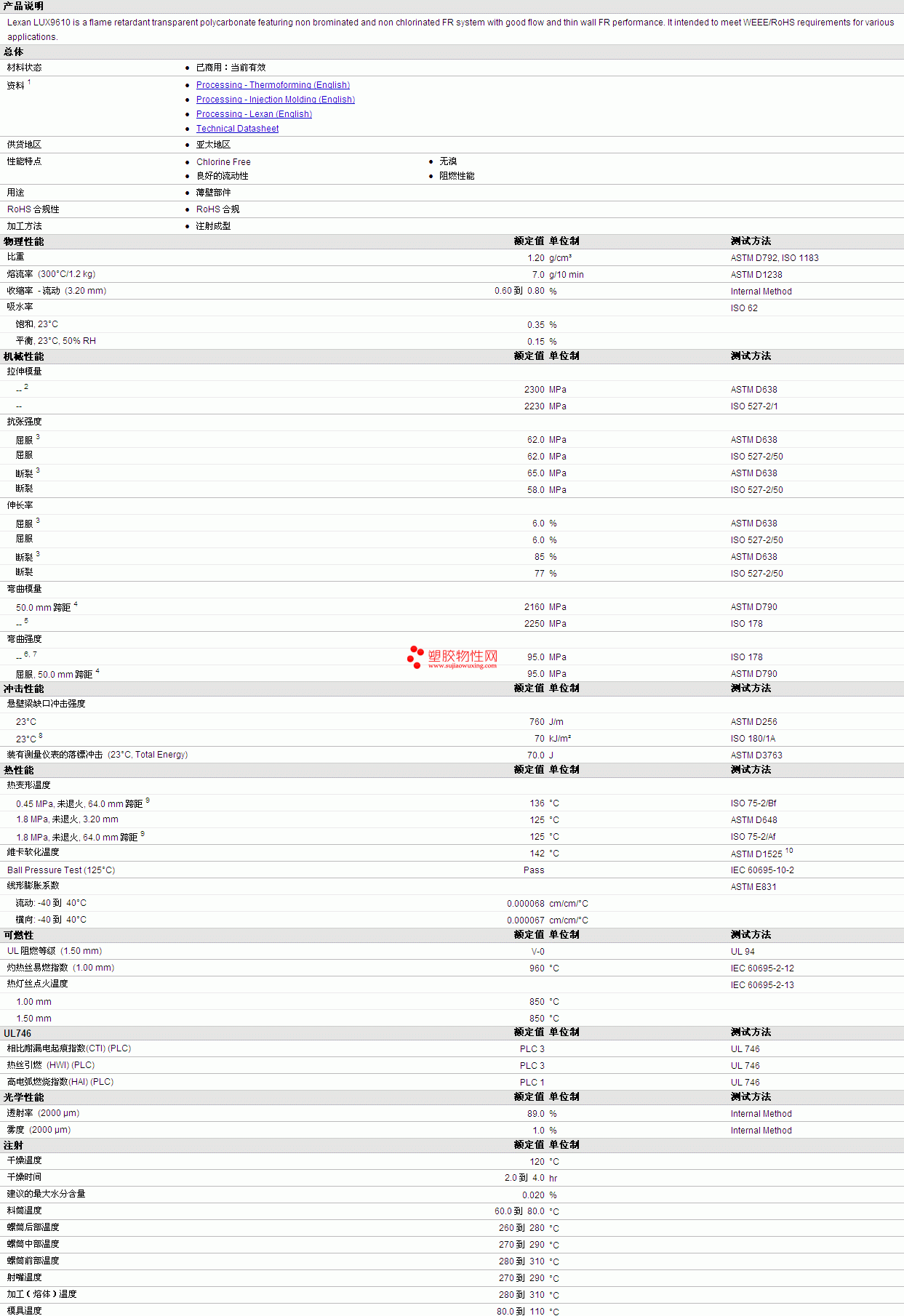 LEXAN PC LUX9610 Resin物性表详情见附件