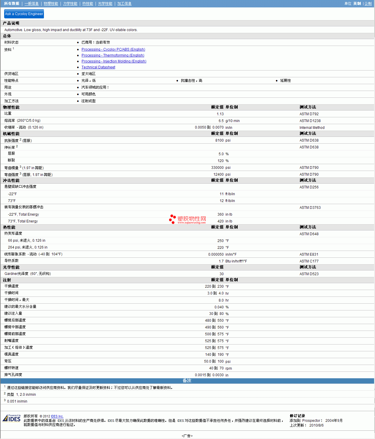 需了解CYCOLOY ABS/PC LG8002 物性表材质证明、ROHS(SGS)报告、物质安全资料表(MSDS)、UL黄卡等可来电咨询:赵先生:13424755533 或QQ:27660005