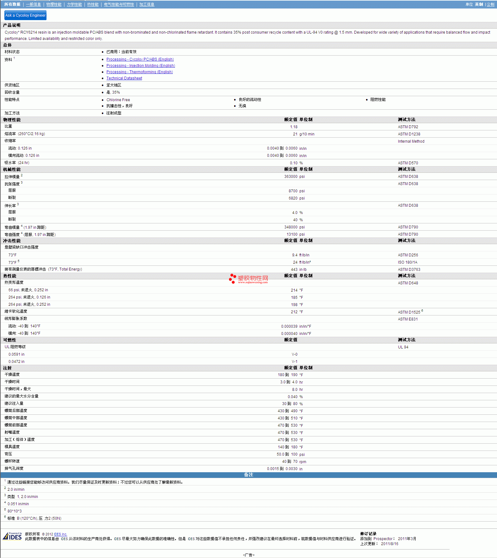 更多CYCOLOY ABS/PC RCY6214 Resin物性表报价,图片、材质证明、UL黄卡、物质安全资料表(MSDS)等可来电咨询赵先生:13424755533或QQ: 27660005