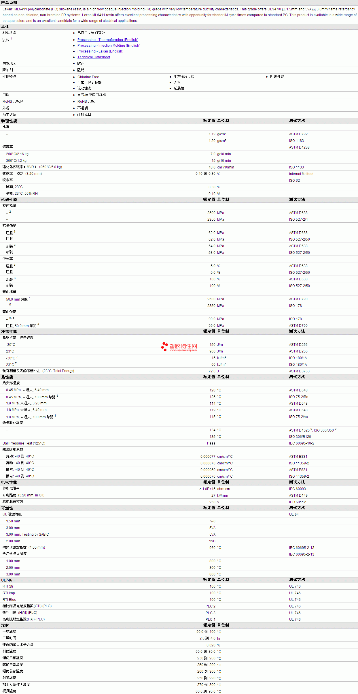 需要了解LEXAN PC ML6411 Resin物性表更多详情,可咨询QQ:767320520