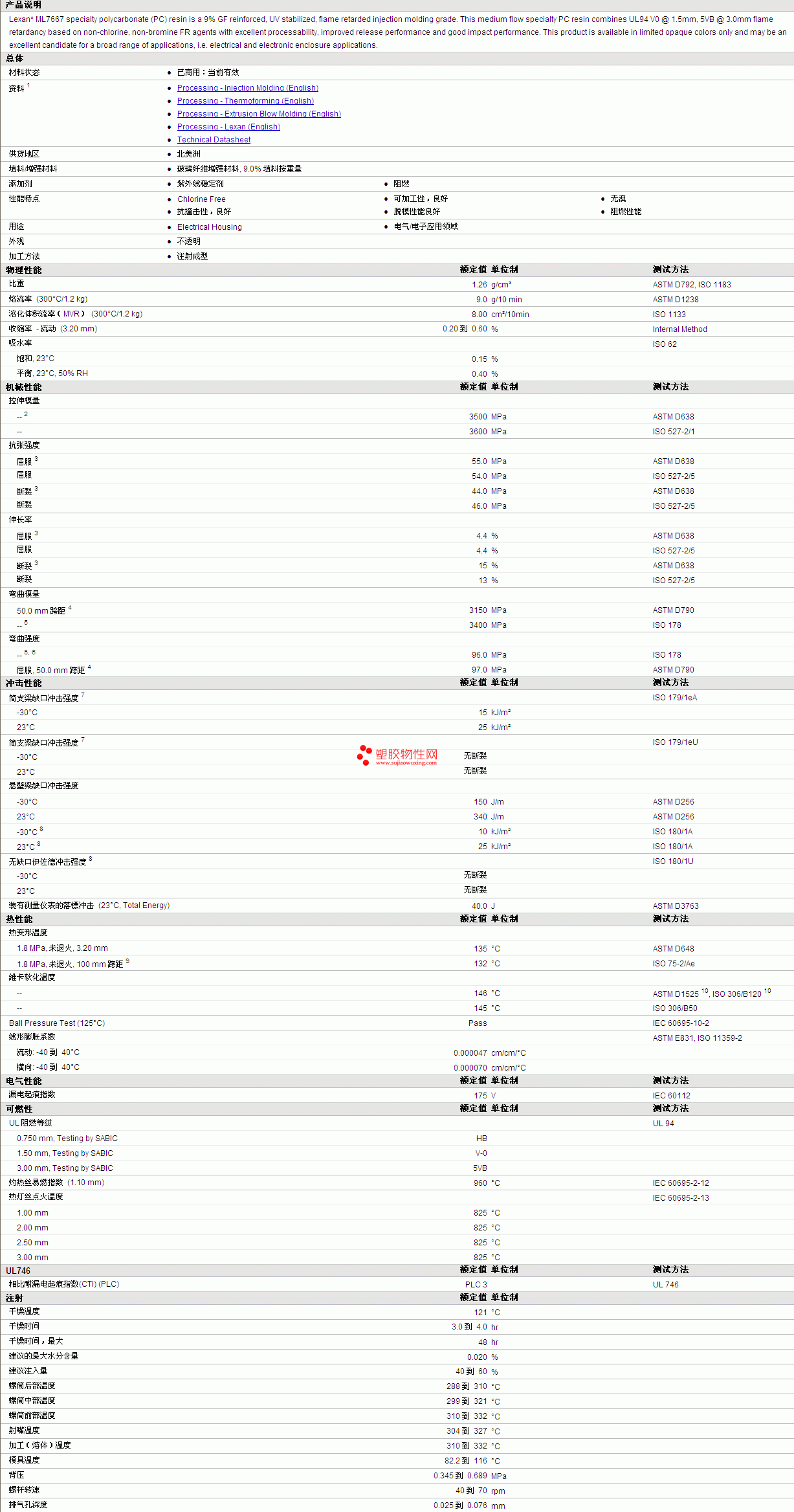 LEXAN PC ML7667 Resin 物性表详细情况如图