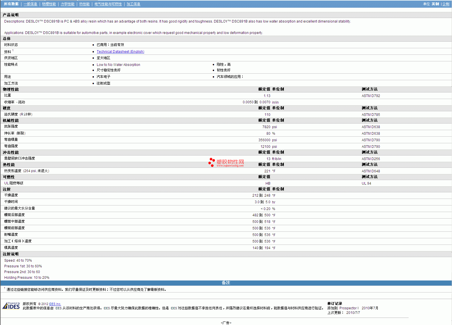 需了解DESLOY ABS/PC DSC891B物性表更多详情,材质证明、ROHS(SGS)报告、物质安全资料表(MSDS)、UL黄卡等,最新行情报价等可来电咨询:赵先生:13424755533或QQ: 27660005