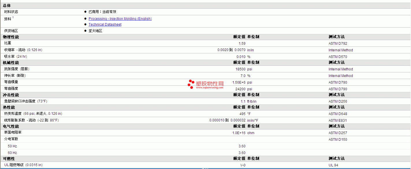 | 弯曲模量 | 1.56E+6 | psi | ASTM D790 |