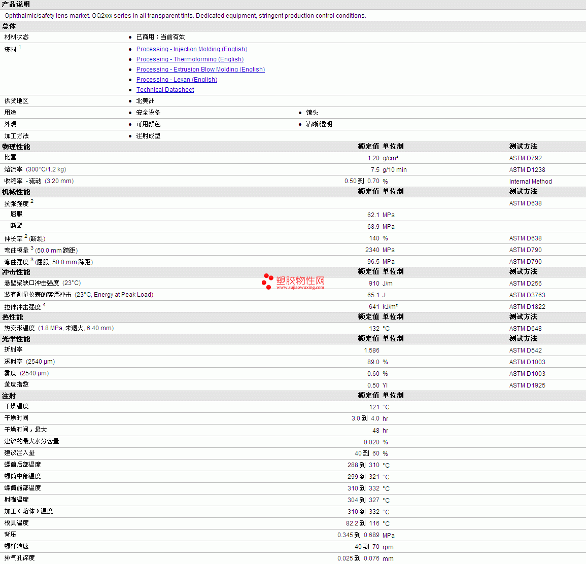 LEXAN PC OQ2720 Resin物性表更多资料见图