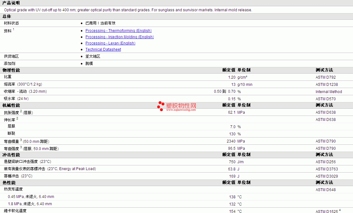 LEXAN PC OQ4320R Resin 物性表更多资料见图