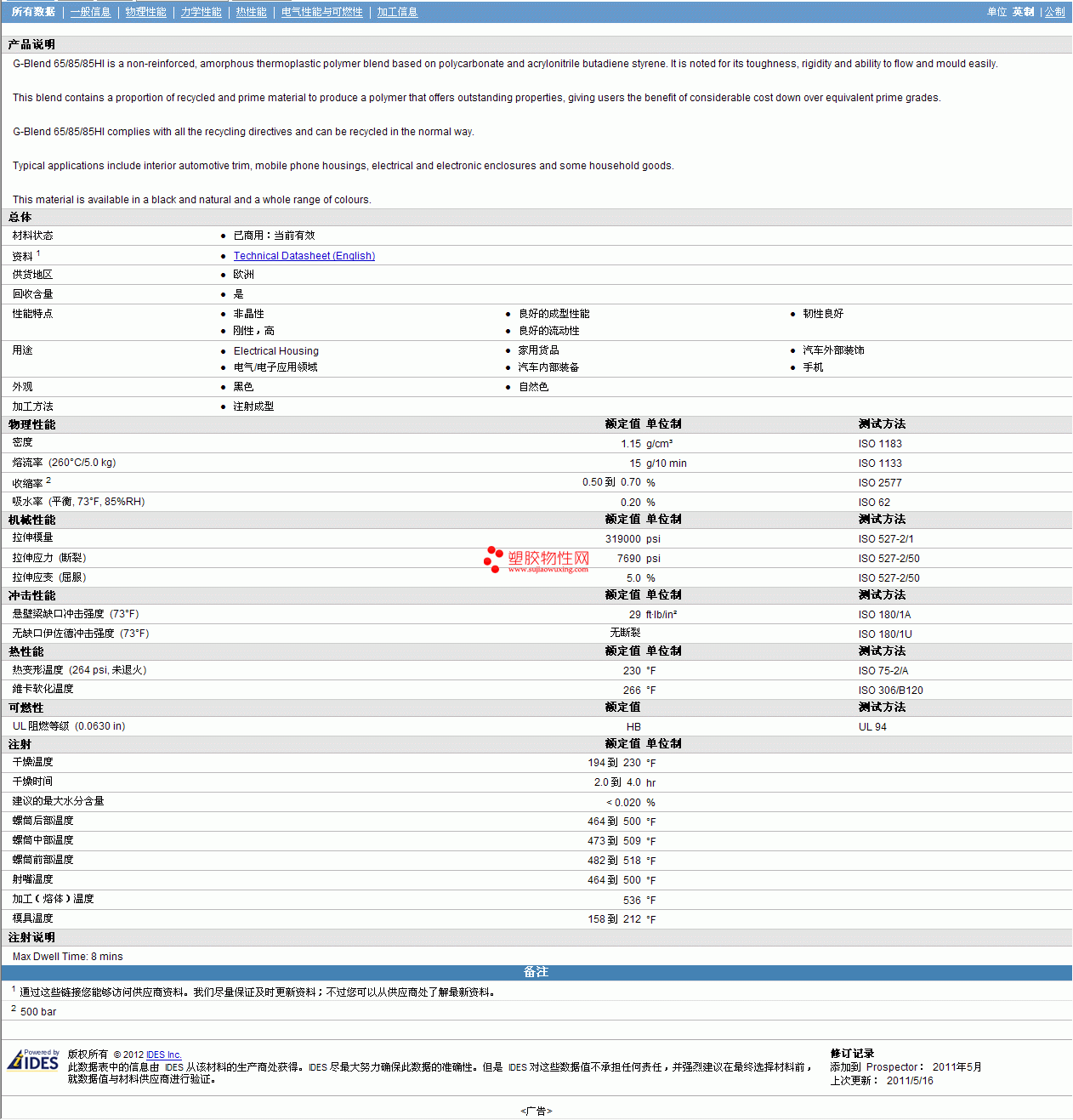 更多G-Blend 85 PC/ABS物性表报价,图片、材质证明、UL黄卡、物质安全资料表(MSDS)等可来电咨询赵先生:13424755533 或QQ:27660005