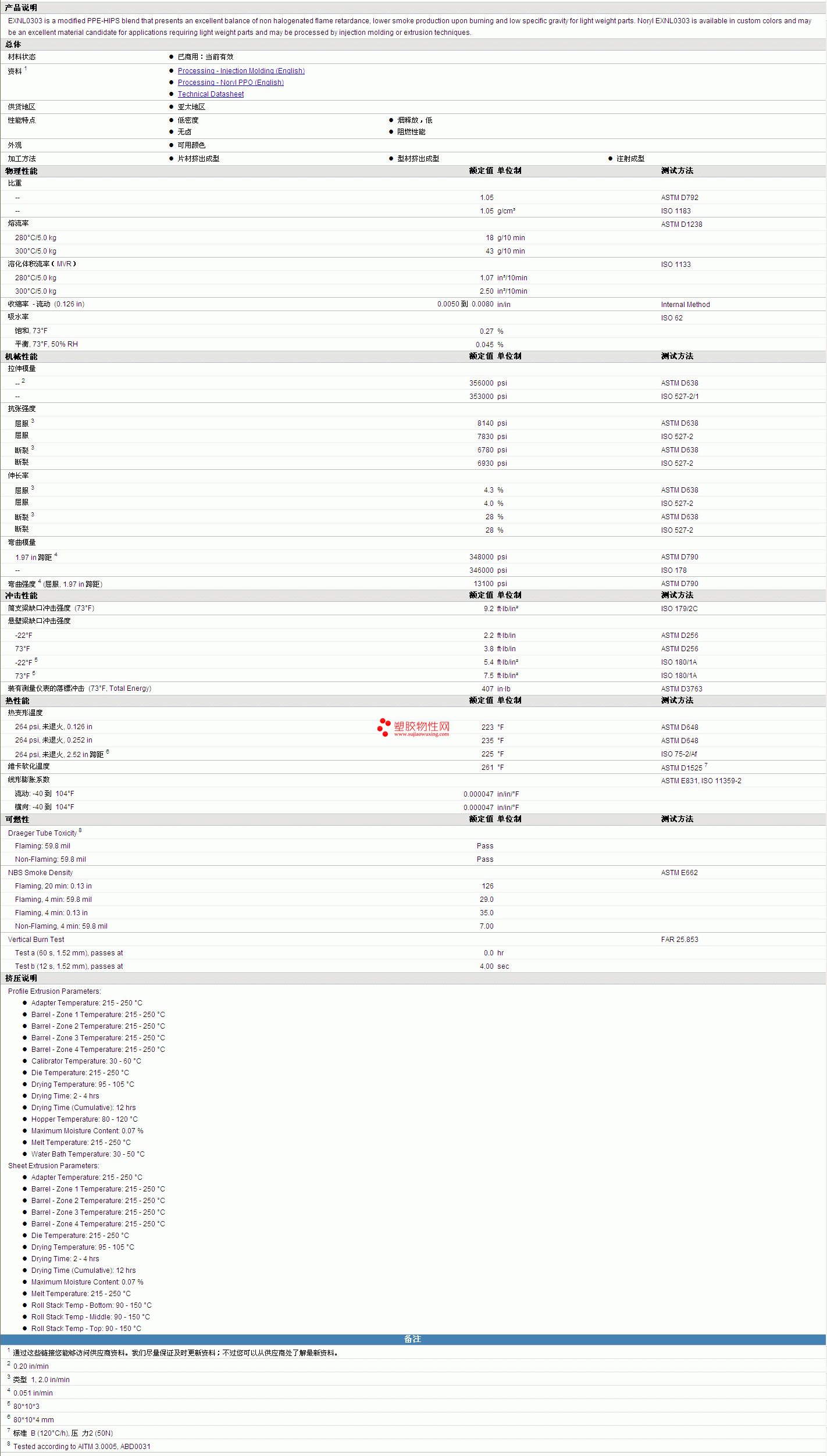 NORYL PPE EXNL0303 Resin物性表 详细情况如图