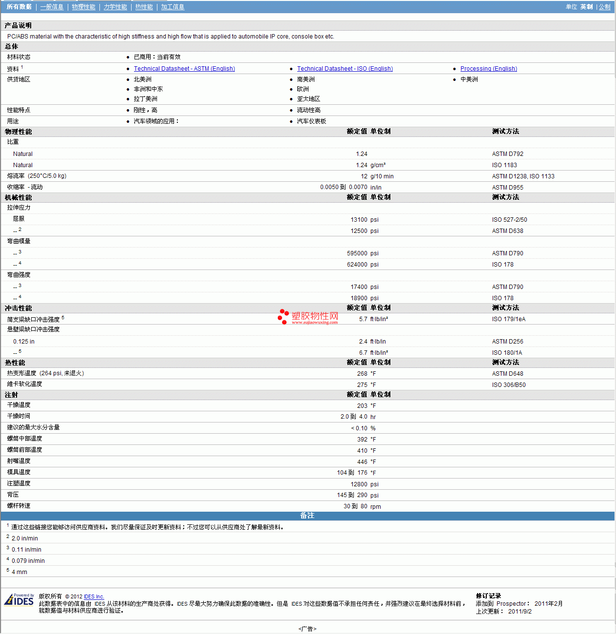 更多Infino ABS/PC WP-1150物性表报价,图片、材质证明、UL黄卡、物质安全资料表(MSDS)等可来电咨询赵先生:13424755533 或QQ:27660005