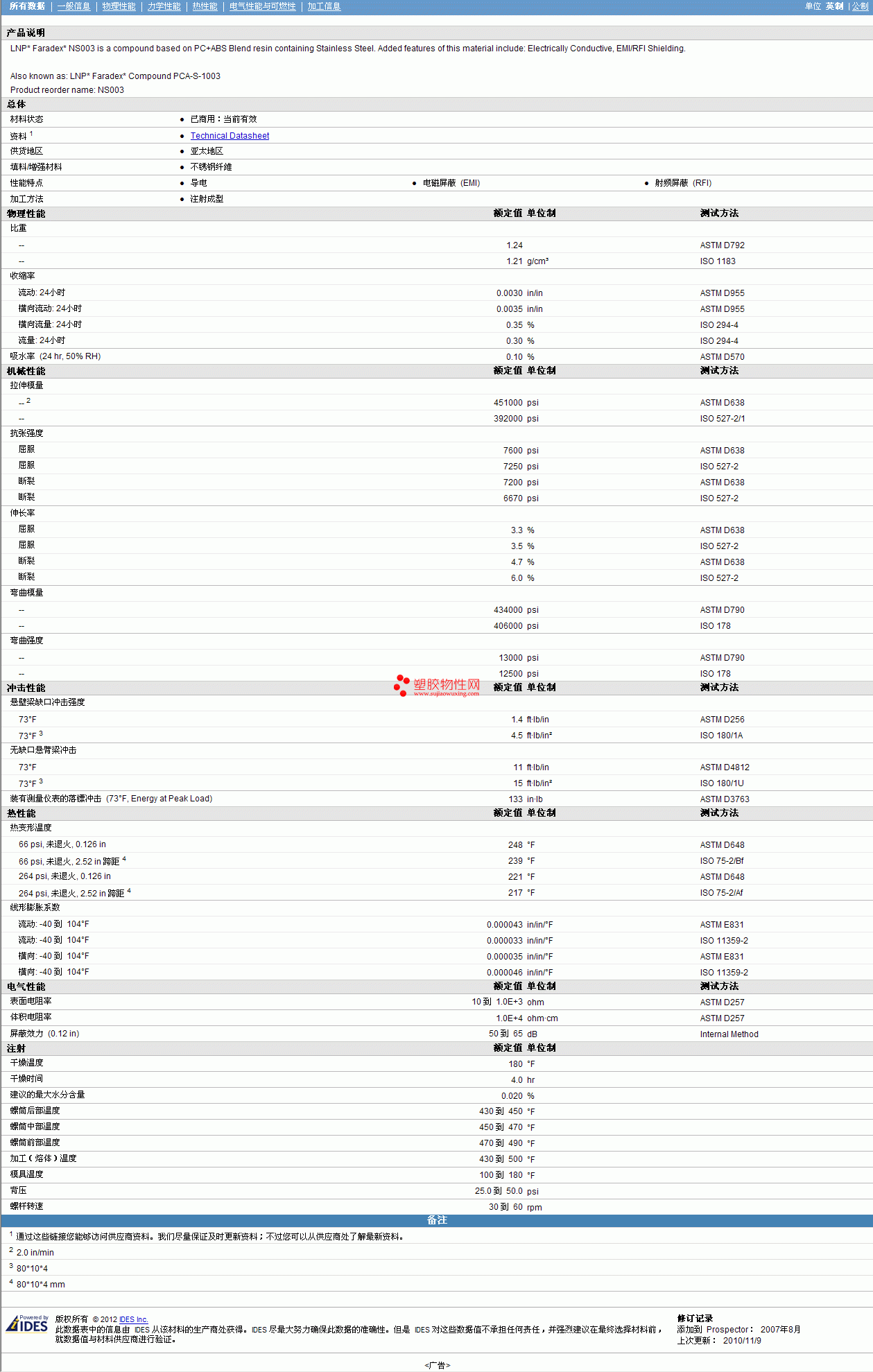 如需了解LNP Faradex ABS/PC NS003物性表更多详情,ROHS(SGS)报告、物质安全资料表(MSDS)、材质证明、UL黄卡等,最新行情报价等可来电咨询:赵先生:13424755533 或QQ:27660005