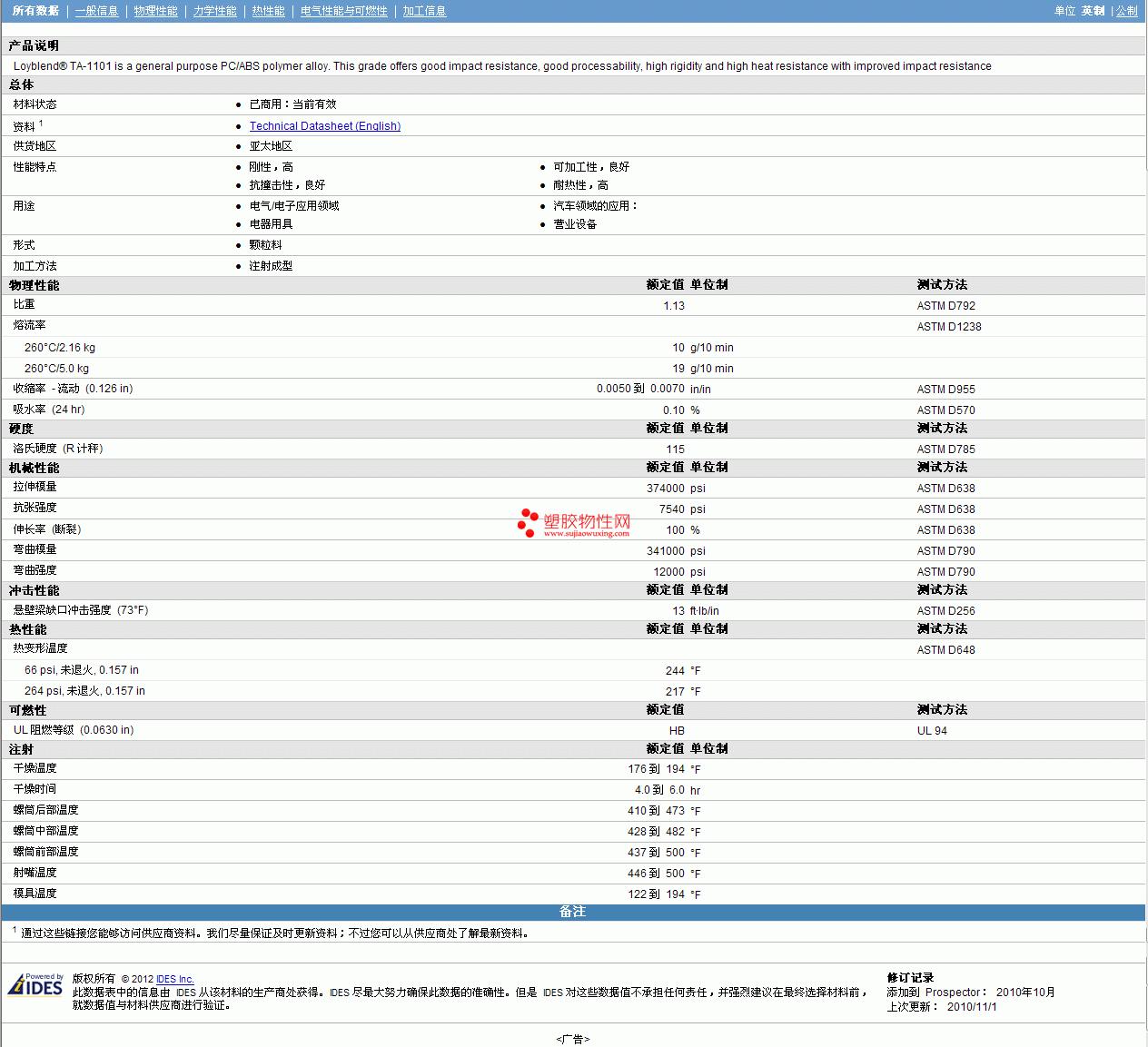 更多Loyblend ABS/PC TA-1101物性表报价,图片、材质证明、UL黄卡、物质安全资料表(MSDS)等可来电咨询赵先生:13424755533 或QQ:27660005