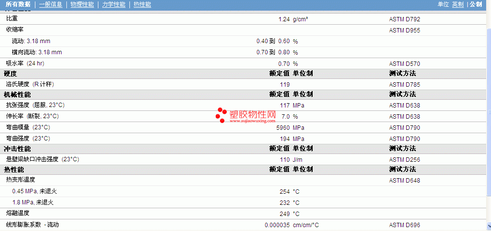 | 洛氏硬度 (R 计秤) | 119 | ASTM D785 |