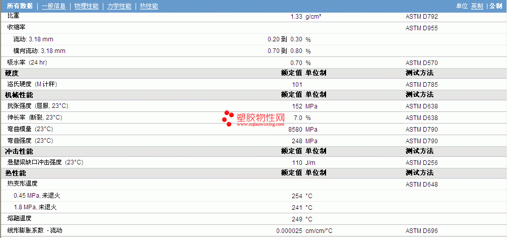 | 洛氏硬度 (M 计秤) | 101 | ASTM D785 |
