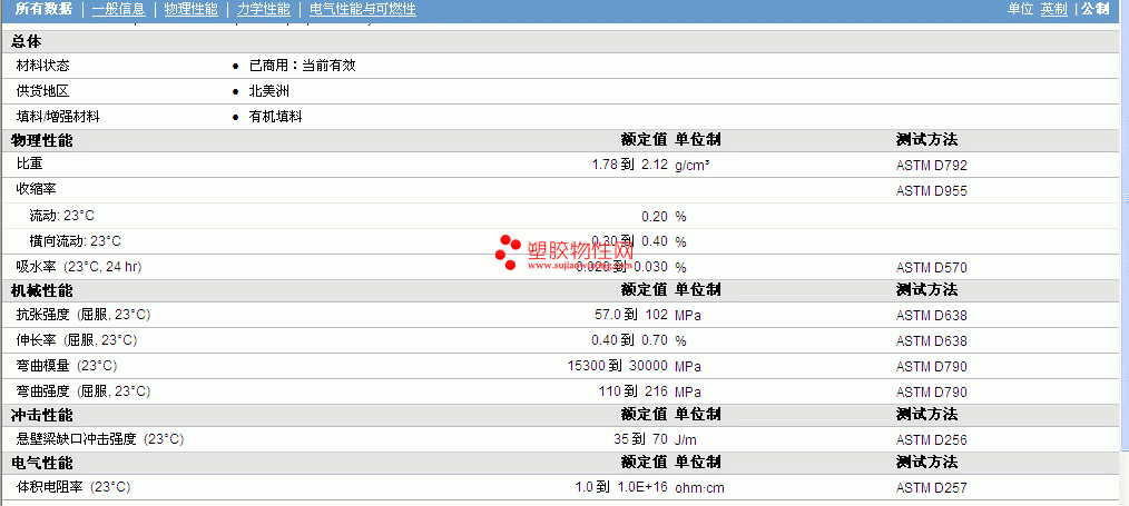 | 比重 | 1.78 到 2.12 | g/cm³ | ASTM D792 |
