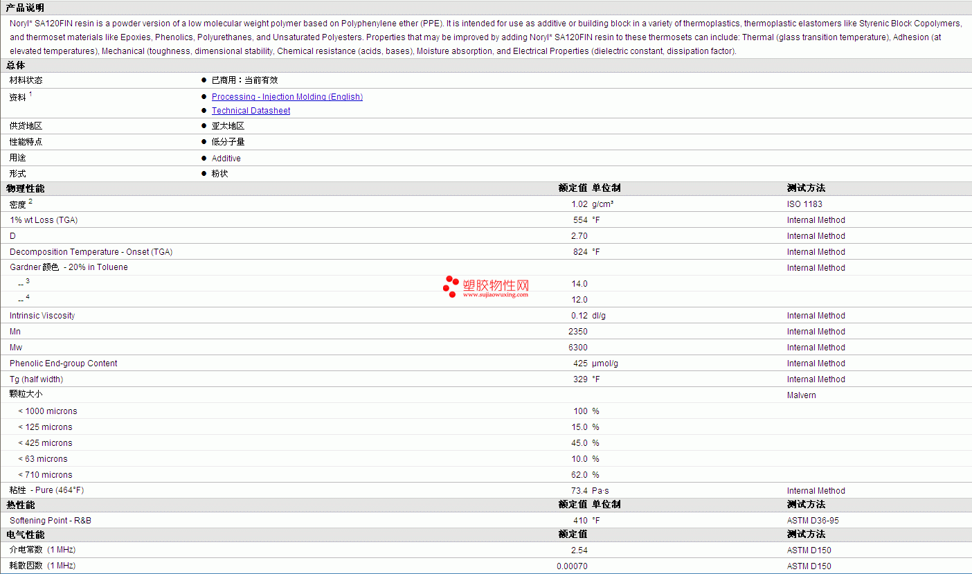 NORYL  PPE  SA120FIN Resin 物性表   详情见附件