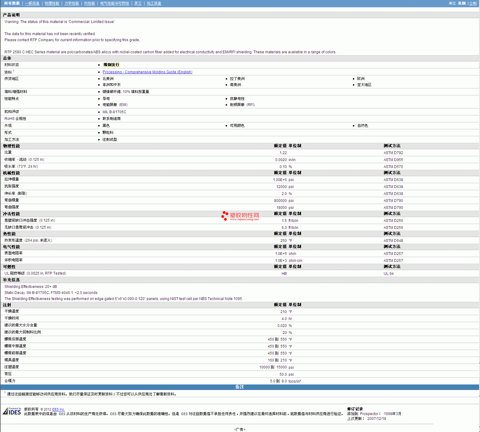 更多RTP Compounds ABS/PC 2581C HEC 物性表报价,图片、材质证明、UL黄卡、物质安全资料表(MSDS)等可来电咨询赵先生:13424755533或QQ: 27660005