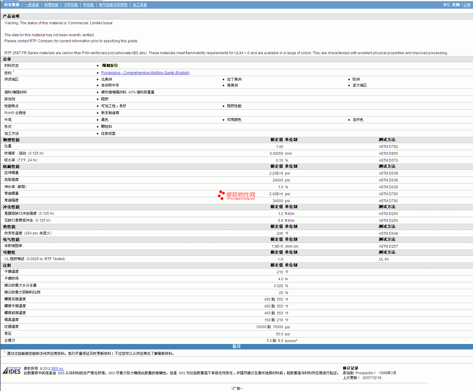 需了解RTP Compounds ABS/PC 2587 FR 物性表材质证明、ROHS(SGS)报告、物质安全资料表(MSDS)、UL黄卡等可来电咨询:赵先生:13424755533或QQ: 27660005