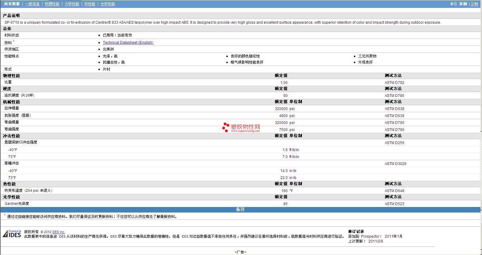 如需了解WeatherPro AES Centrex /ABS SP-6710 物性表更多详情,ROHS(SGS)报告、物质安全资料表(MSDS)、材质证明、UL黄卡等,最新行情报价等可来电咨询:赵先生:13424755533或QQ: 27660005