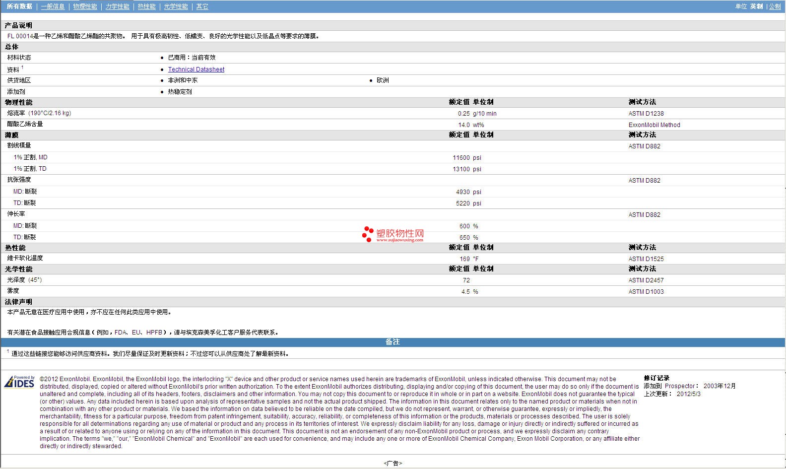 需了解Escorene AES Ultra FL 00014 物性表更多详情,材质证明、ROHS(SGS)报告、物质安全资料表(MSDS)、UL黄卡等,最新行情报价等可来电咨询:赵先生:13424755533或QQ: 27660005