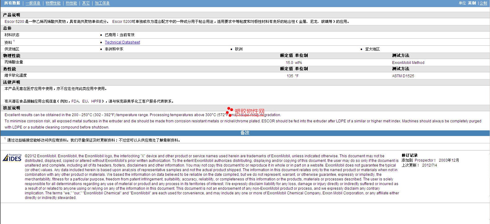 更多Escor AES 5200 物性表报价,图片、材质证明、UL黄卡、物质安全资料表(MSDS)等可来电咨询赵先生:13424755533或QQ: 27660005