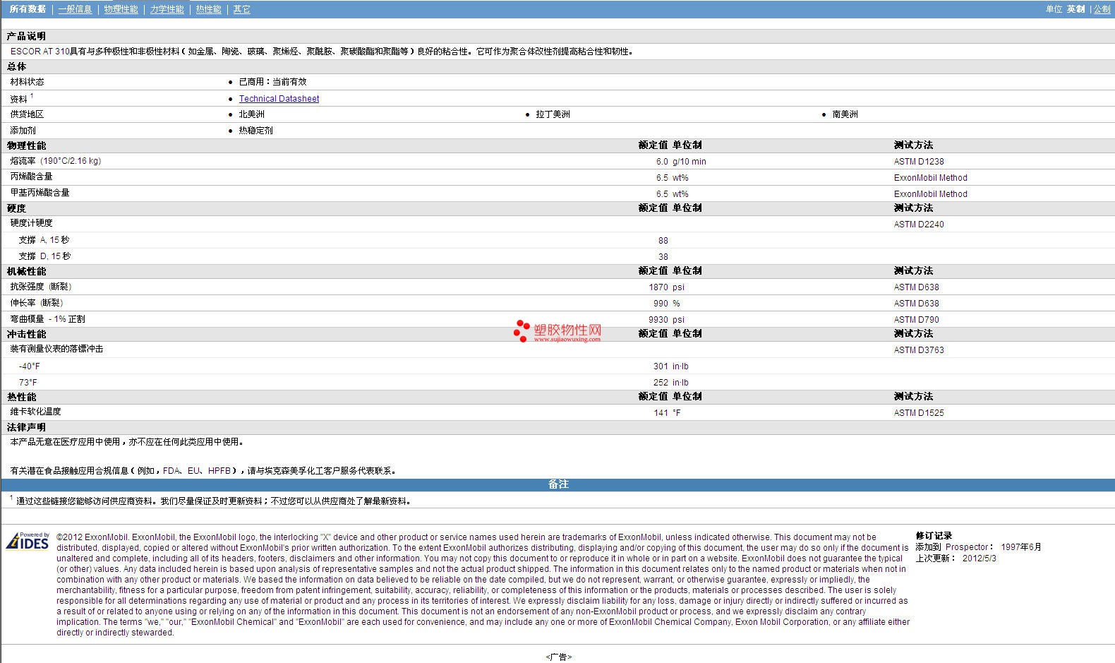 更多Escor AES AT 310 Molding 物性表报价,图片、材质证明、UL黄卡、物质安全资料表(MSDS)等,最新行情报价等可来电咨询赵先生:13424755533或QQ: 27660005