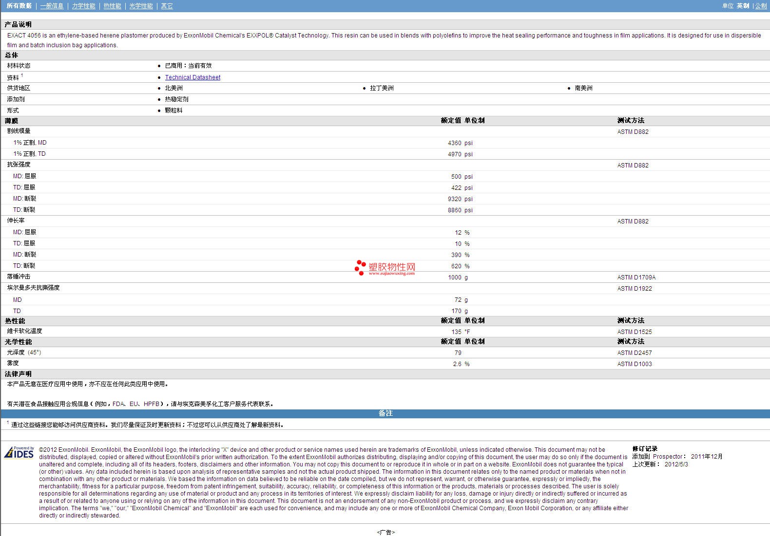如需了解Exact AES 4056 物性表更多详情,ROHS(SGS)报告、物质安全资料表(MSDS)、材质证明、UL黄卡等,最新行情报价等可来电咨询:赵先生:13424755533或QQ: 27660005
