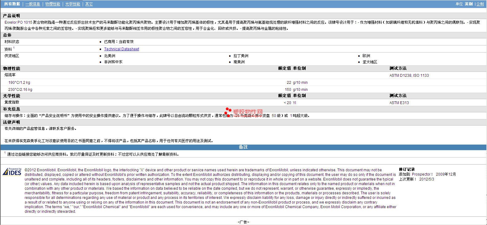 需了解Exxelor AES PO 1015 物性表更多详情,材质证明、ROHS(SGS)报告、物质安全资料表(MSDS)、UL黄卡等,最新行情报价等可来电咨询:赵先生:13424755533或QQ: 27660005