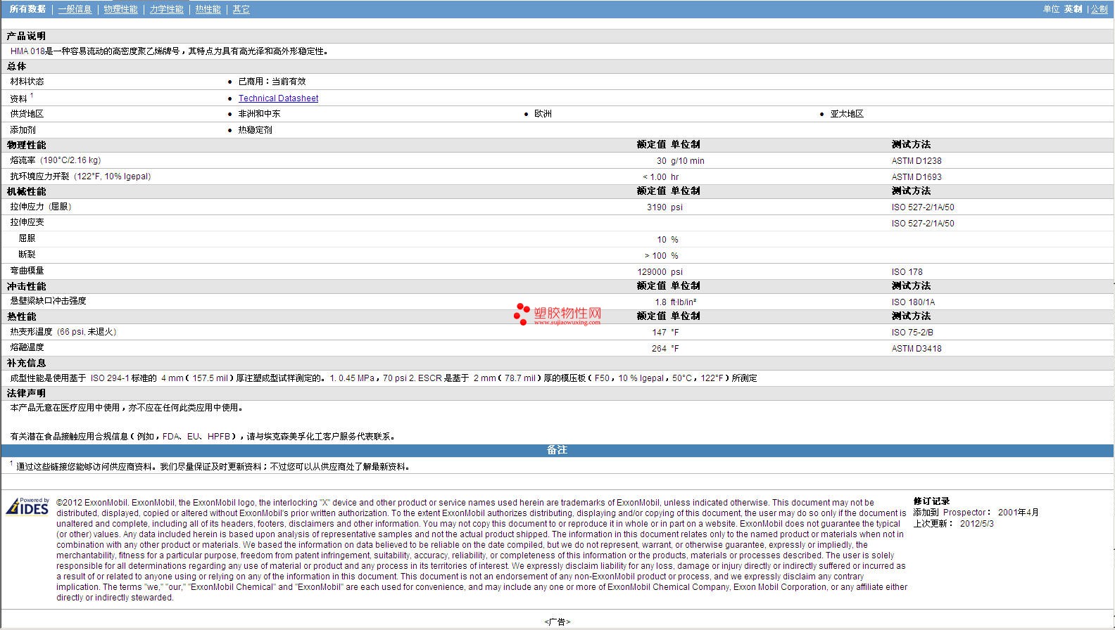 更多ExxonMobil AES HDPE HMA 018 物性表报价,图片、材质证明、UL黄卡、物质安全资料表(MSDS)等可来电咨询赵先生:13424755533或QQ: 27660005